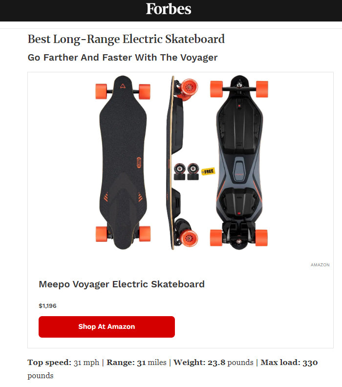 The MEEPO Voyager has earned a Forbes recommendation as a standout in electric skateboarding, recognized for its exceptional performance, durability, and all-terrain versatility. Whether you're looking for a high-speed commute or an adventure-ready board, the Voyager is celebrated for pushing the boundaries of what an electric skateboard can do.