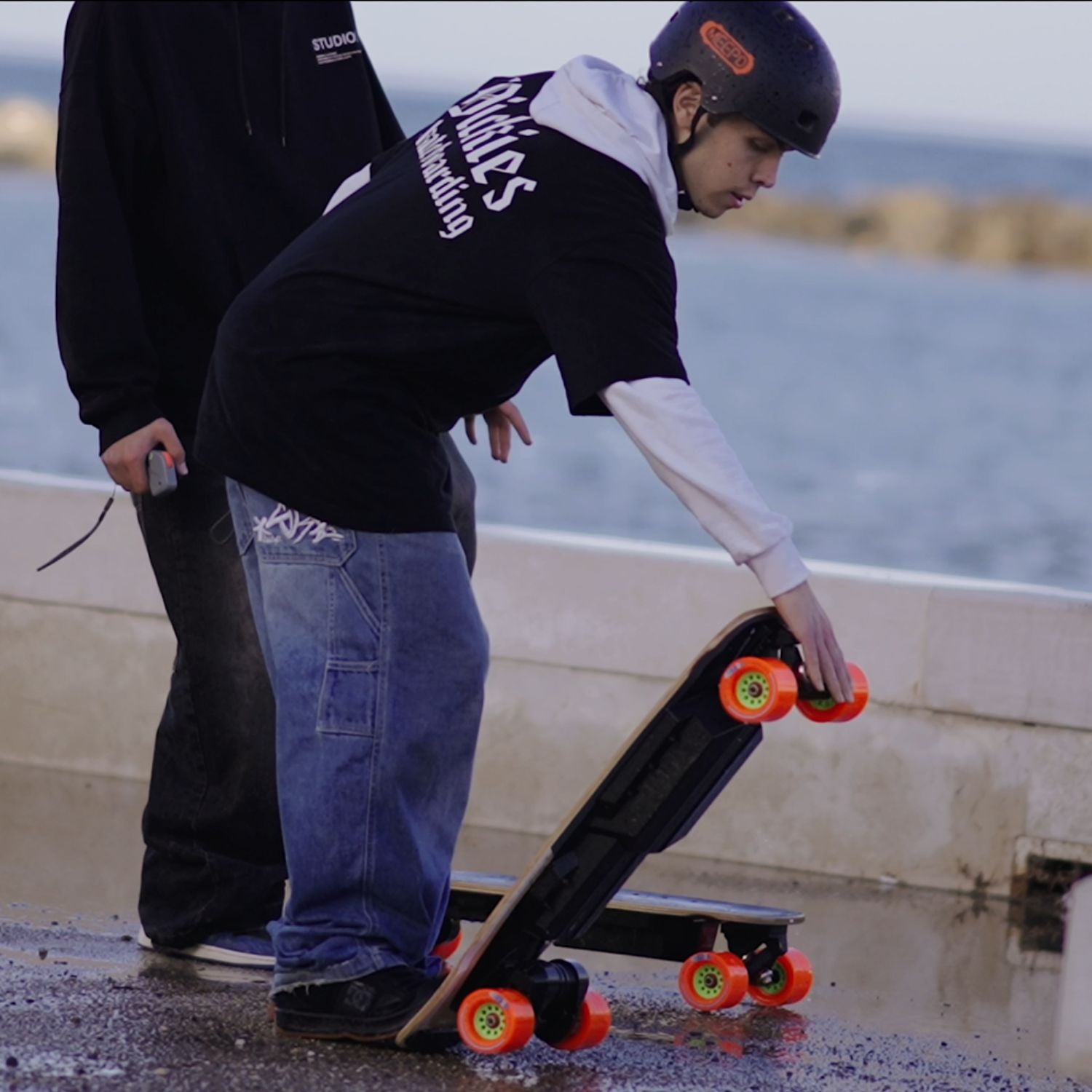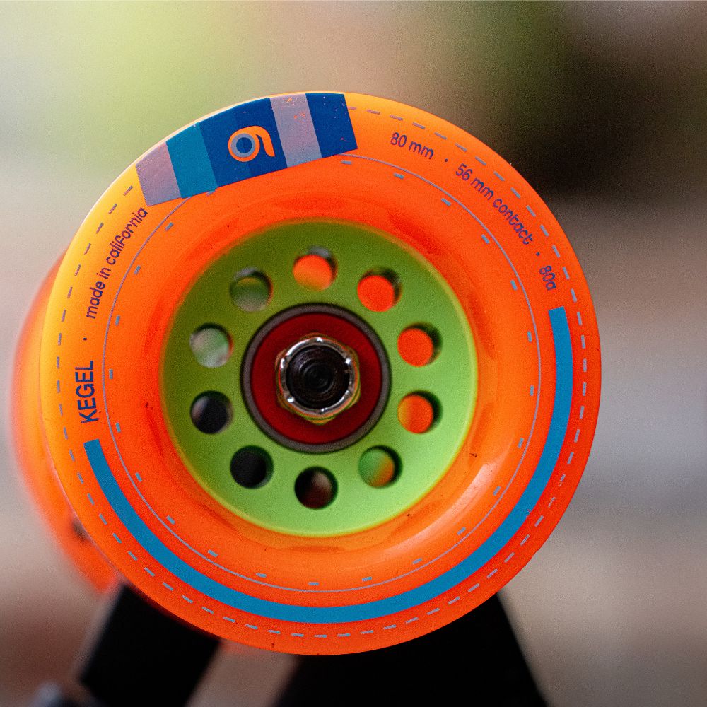 The board rolls on Kegel 80x56mm wheels, featuring an 80A durometer for a perfect balance of grip and smoothness. These high-rebound orange wheels ensure stability across various surfaces while maintaining a lively ride experience.