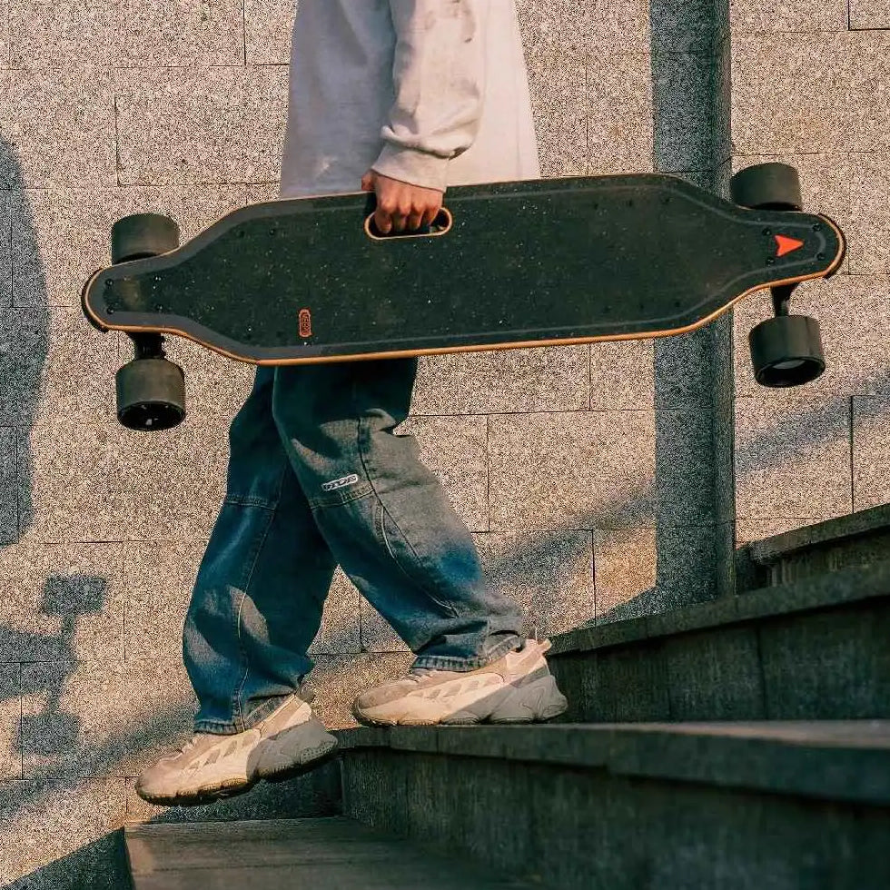 The cut-out part from the board allows easy portability. With a weight of 17.6 lbs, it is easy to carry. Just grab and go! The push-to-start feature allows you to turn on your electric skateboard by a simple push forward! Turn on your remote, push forward and off you go!